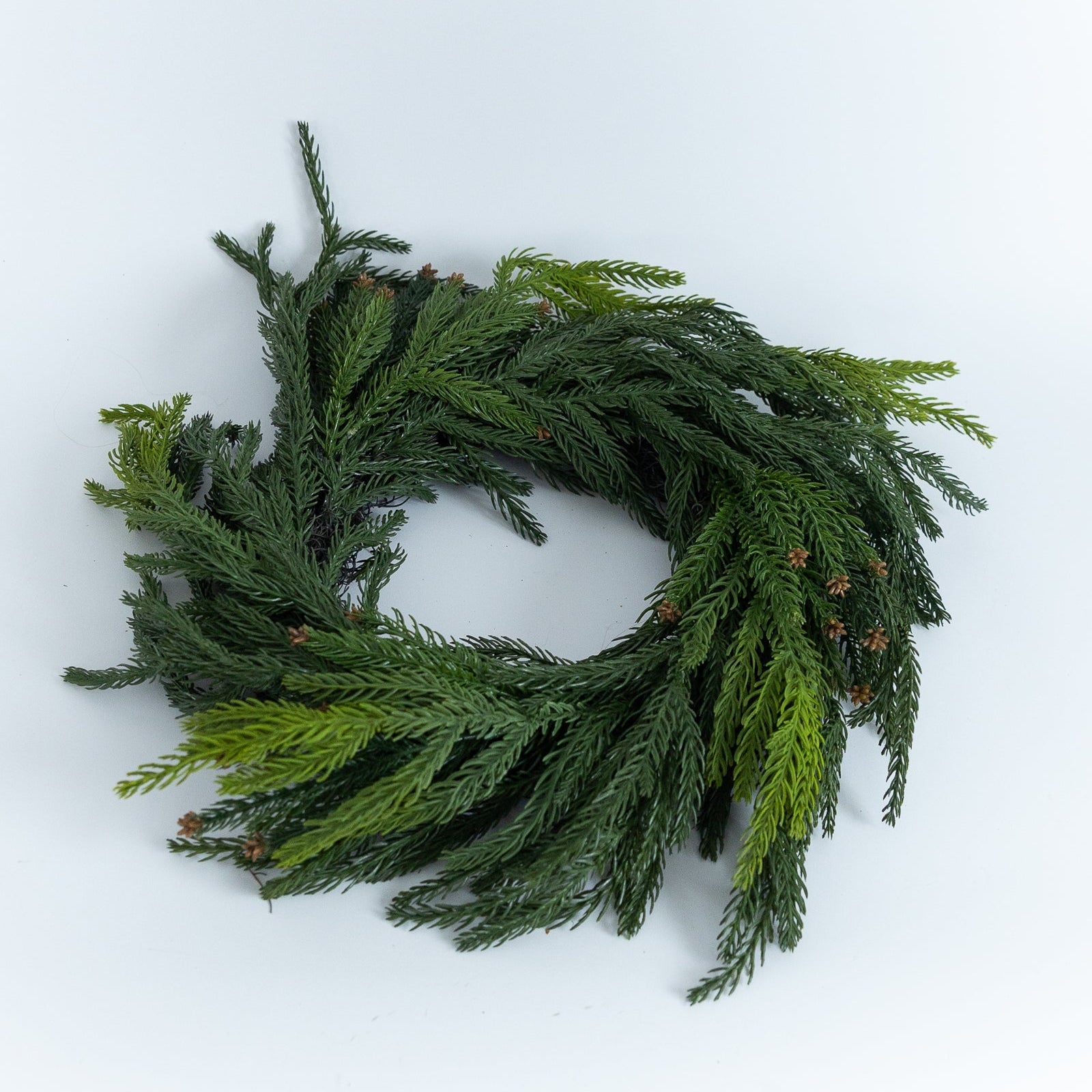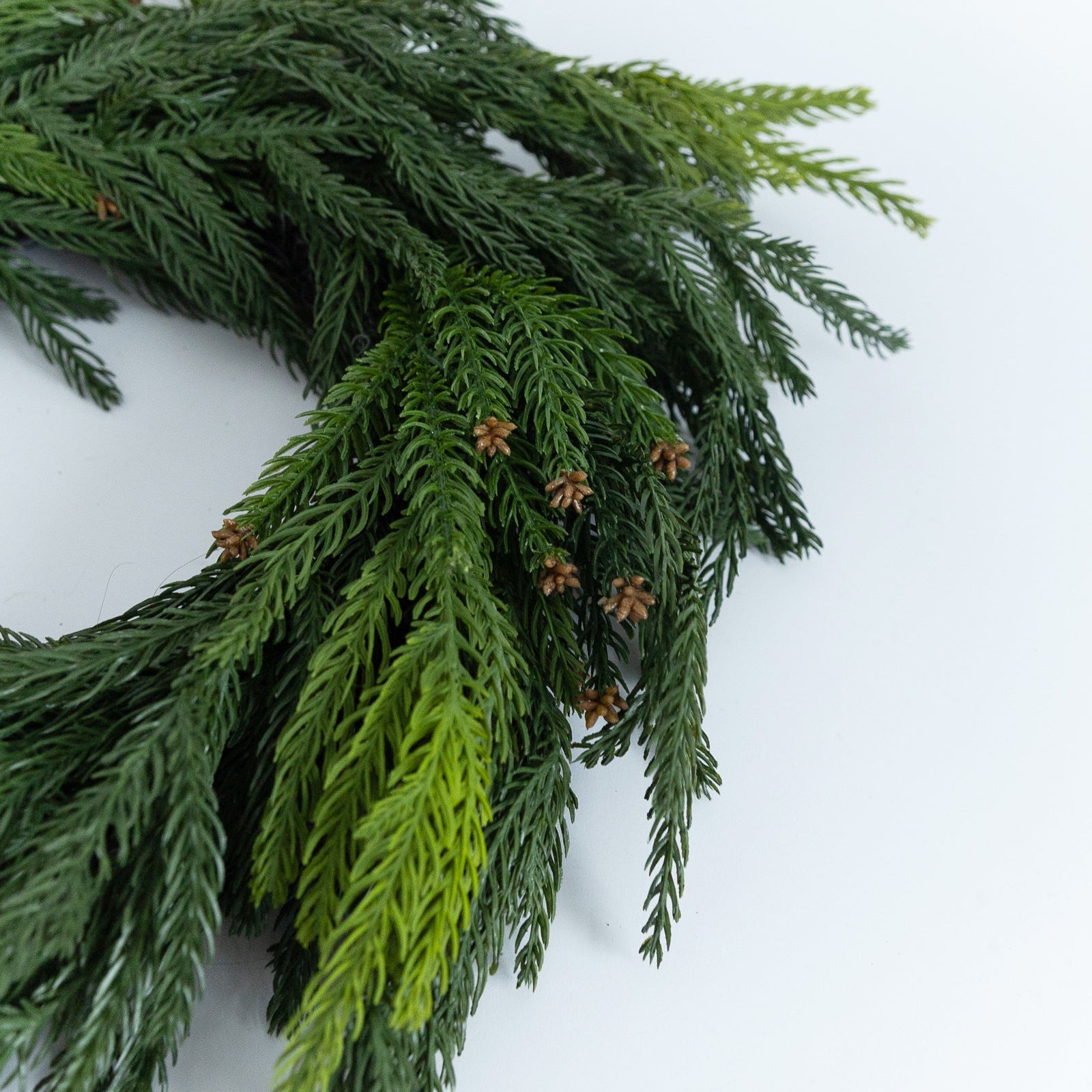 Its organic shape and soft, trailing branches make it the perfect addition to doors, windows, or mantels — adding a touch of woodland simplicity to your Christmas décor. Finished with a twine loop for easy hanging, this wreath feels right at home in spaces that celebrate the quiet elegance of nature. Pairs perfectly with our Norfolk Cascade Garland.