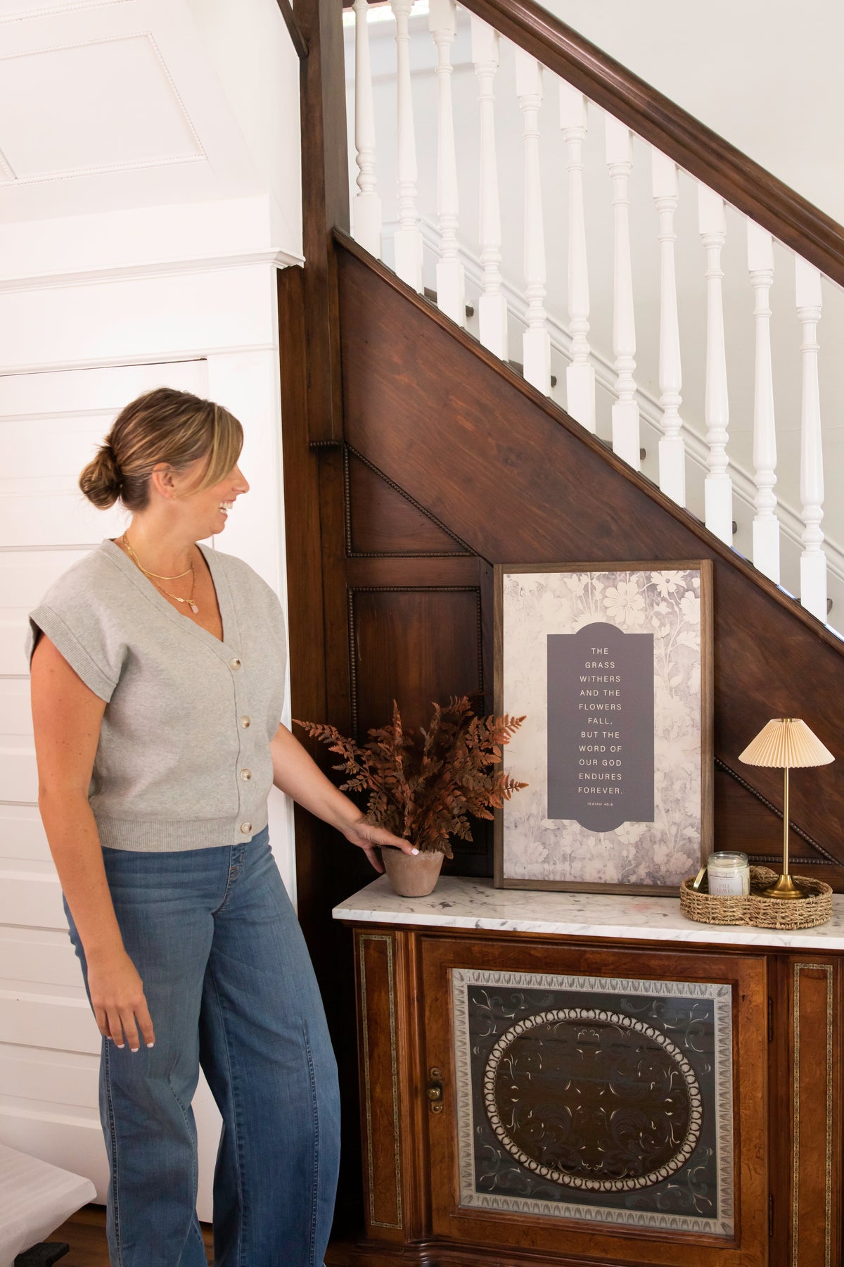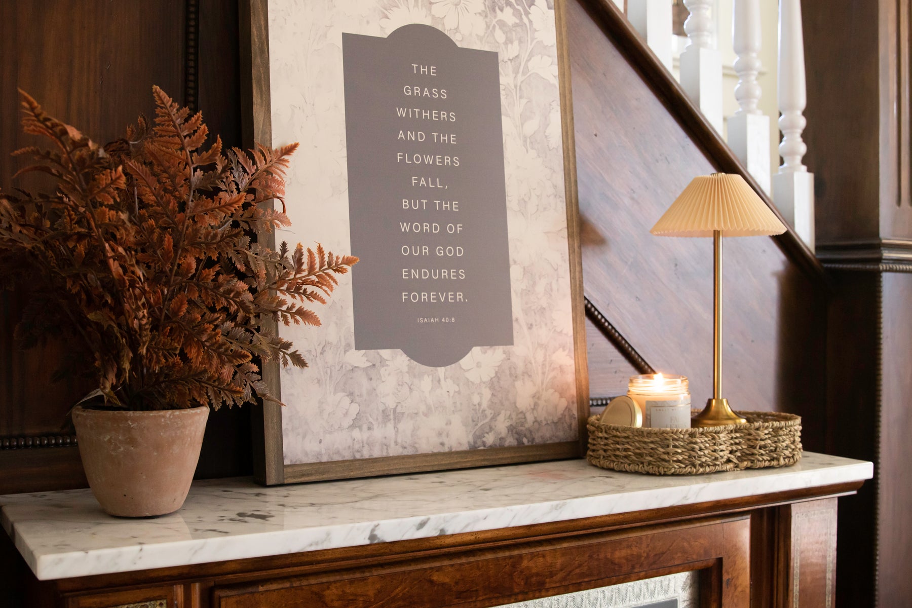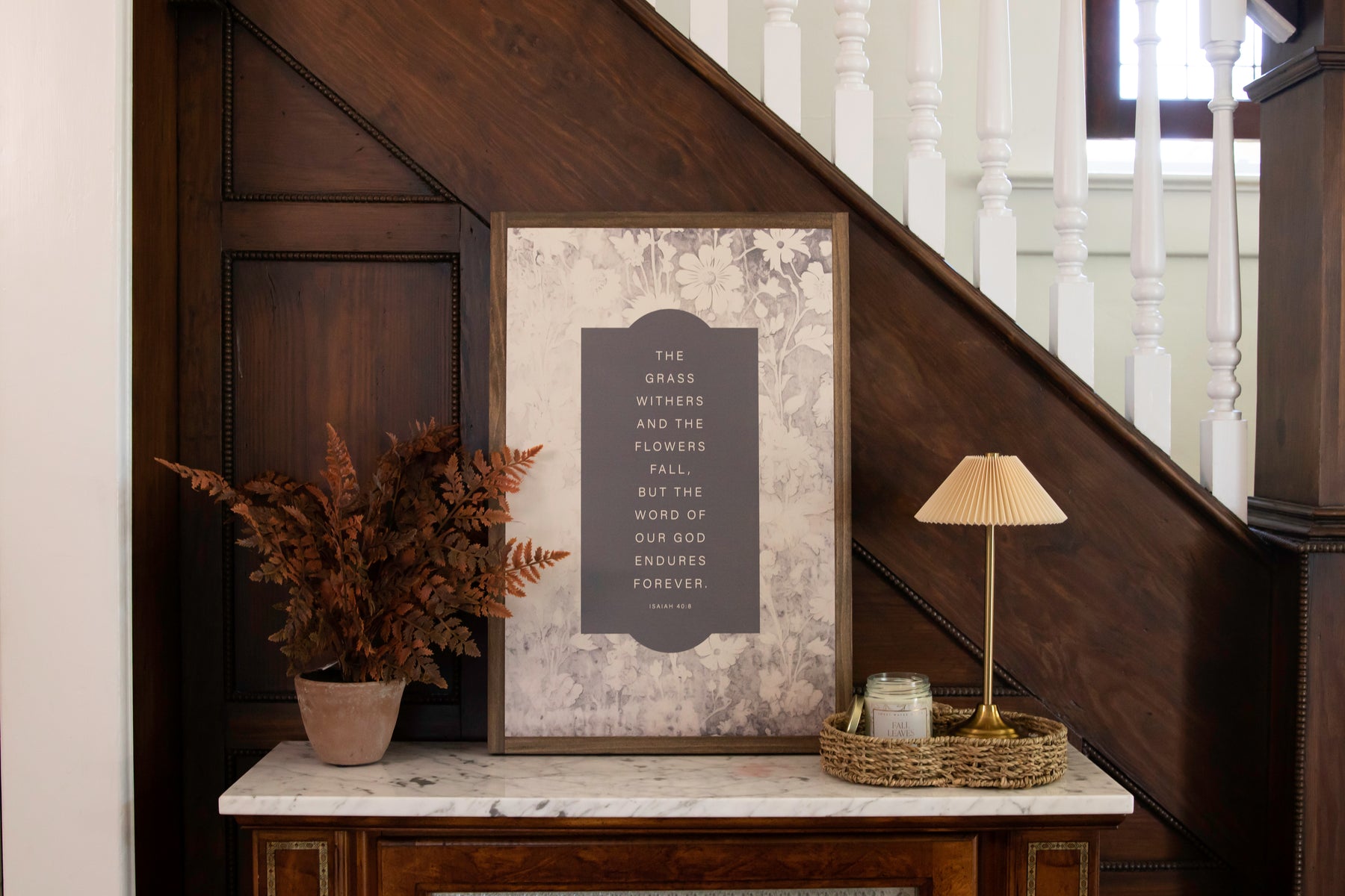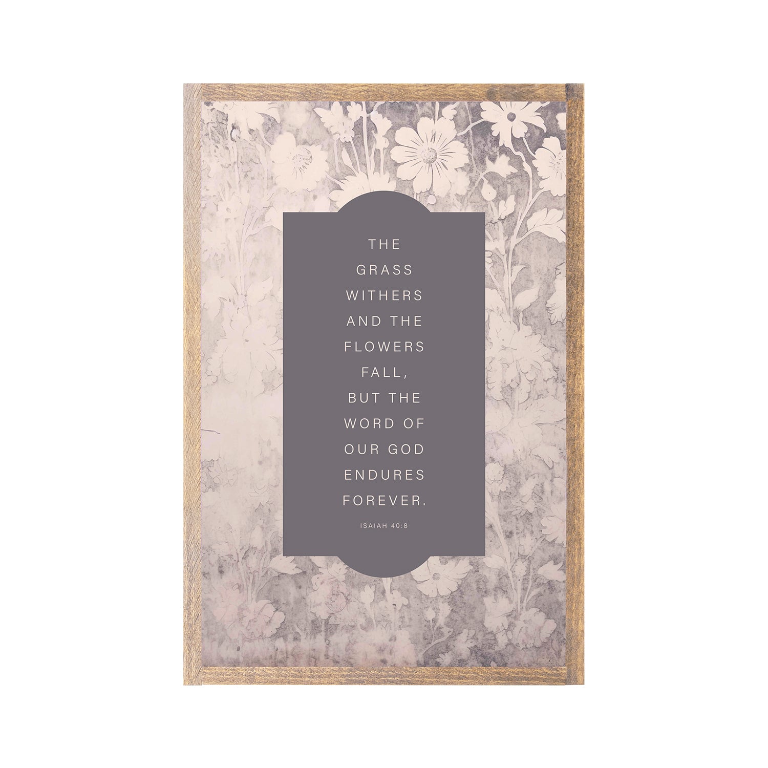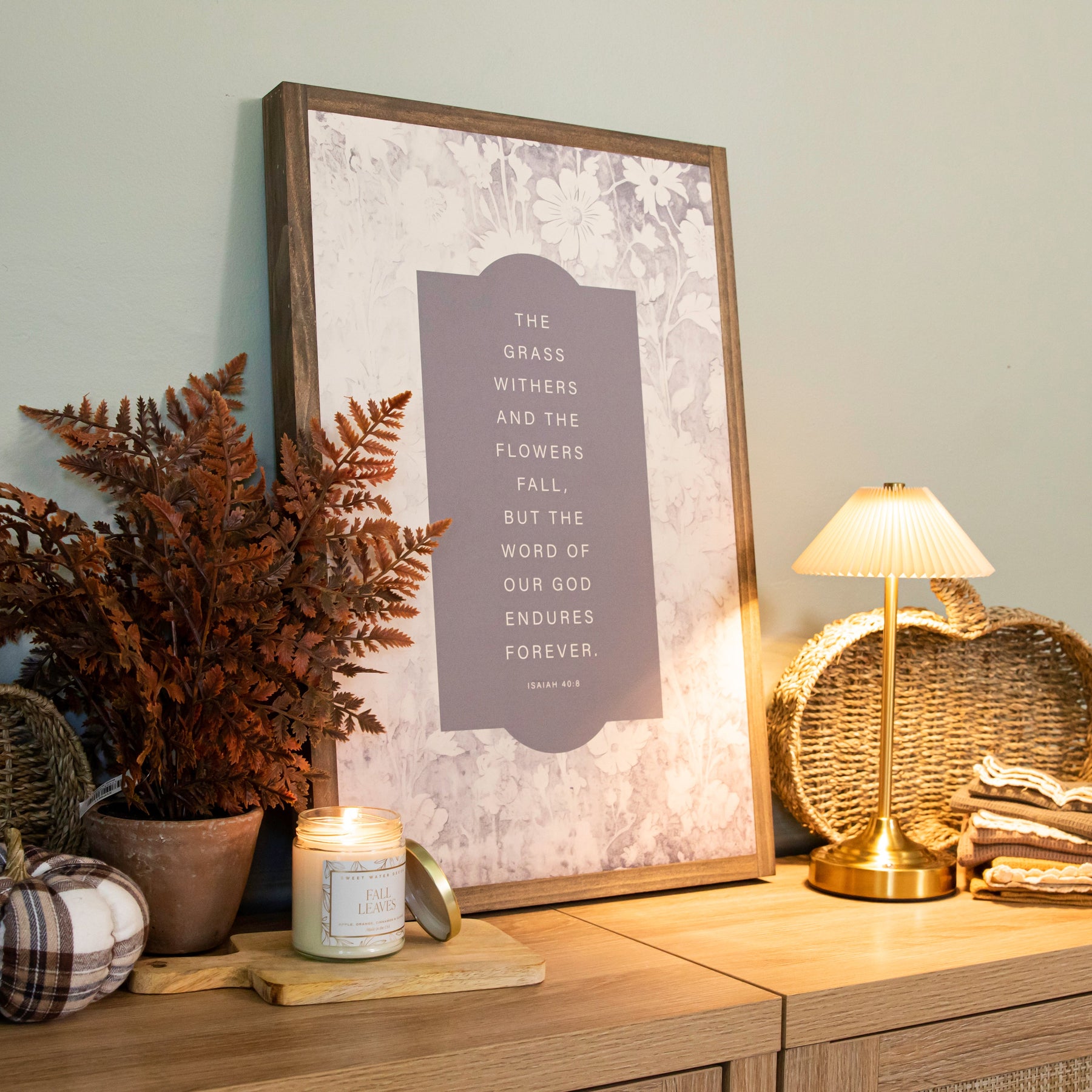 Framed in a lovely vintage design featuring cream and shades of gray/brown, the words of Isaiah 40:8 are a lovely sentiment for the fall season.
