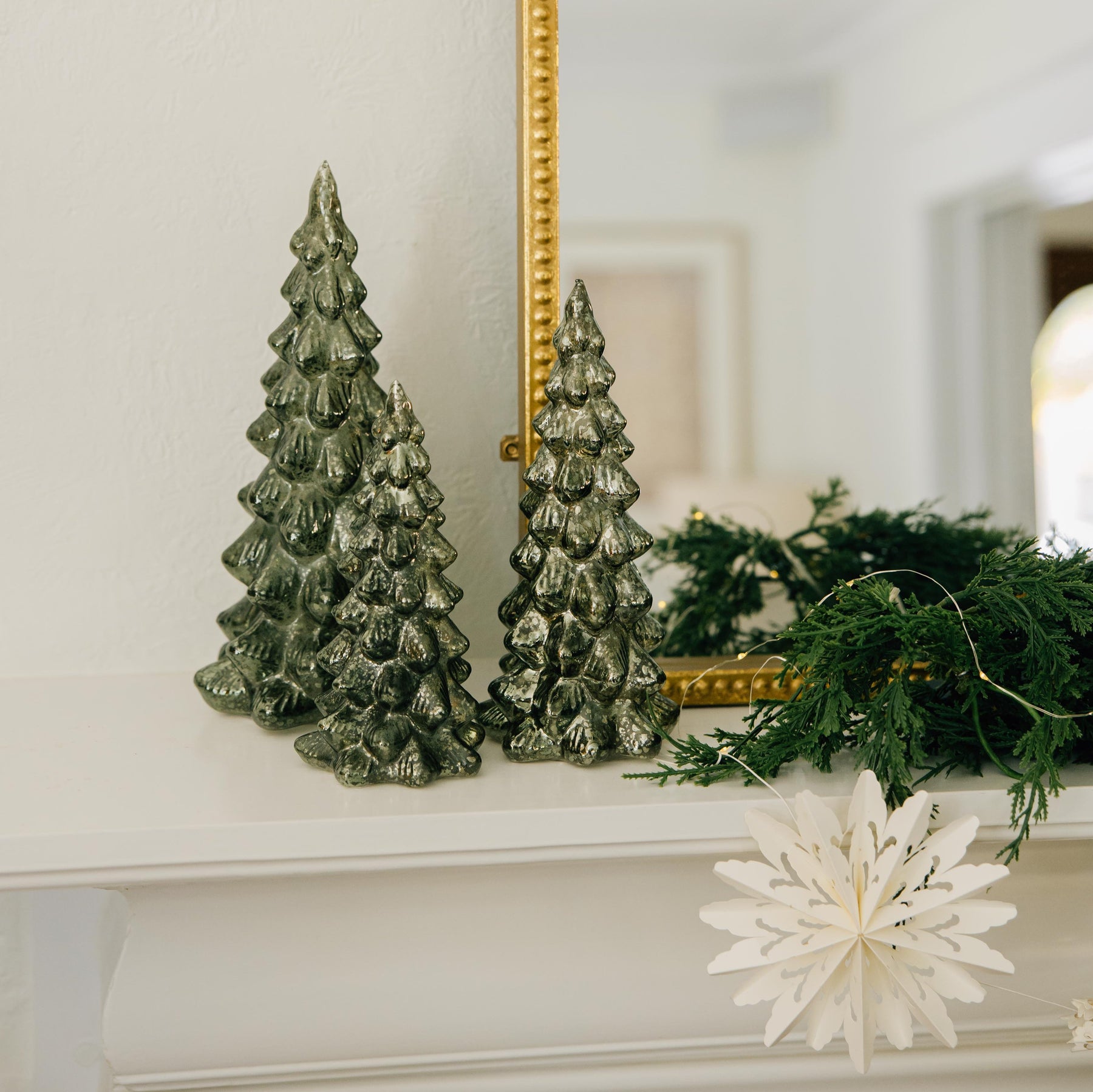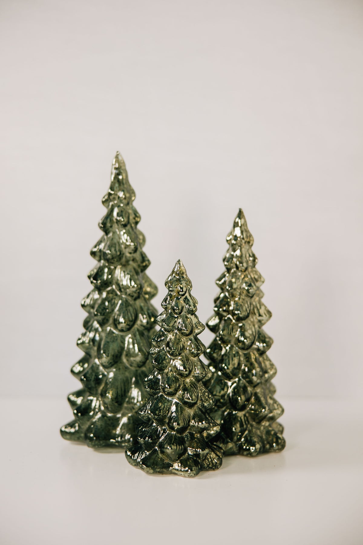 Beyond charming, our Mercury Glass Light Up Trees are sure to become a holiday/winter decorating favorite in your home! When not lit, the dark gree trees show off a shimmery effect creating a snow-like appearance, and when lit they become a nostalgic light source enhancing any vignette or tabletop.