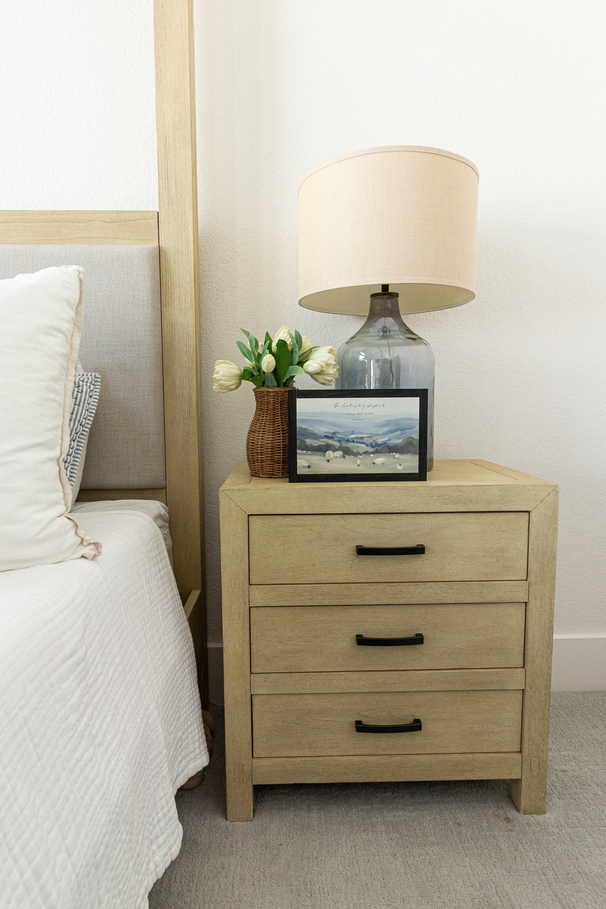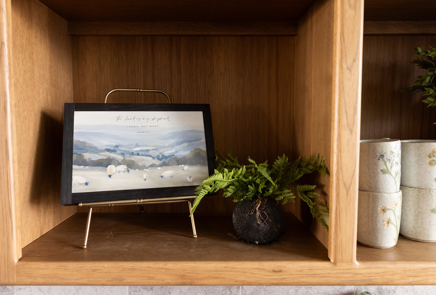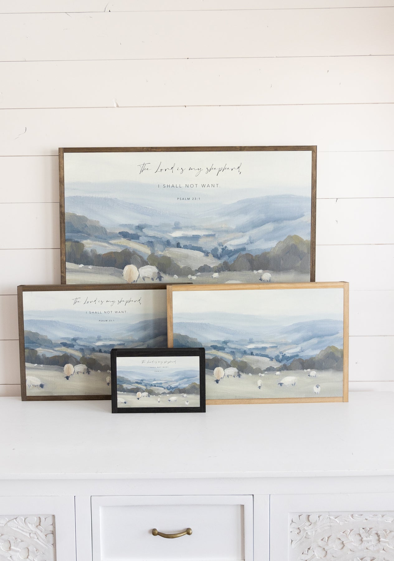 Available in a variety of frame finishes, this artwork complements both modern and traditional spaces. Style it above a mantel, in a bedroom retreat, nursery, or living room gallery wall as a grounding focal point. With its soothing palette and timeless scripture, Psalm 23 serves as a daily reminder of comfort, guidance, and unwavering care—beautifully woven into the rhythm of your home.
